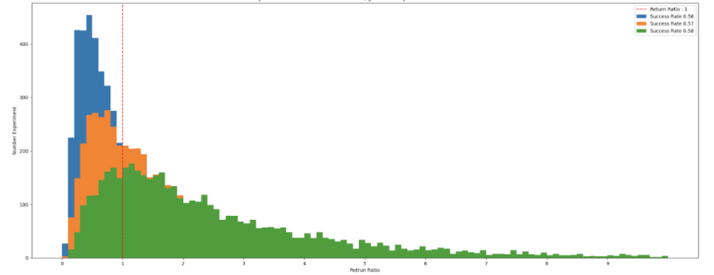 We can also calculate the final return distribution by obtaining the K scenarios’ final result, Figure 4. the distribution can give us information about the confidence and feasibility of targeting a specific return. Also, we can change the parameters ( success rate, T, market. distribution) to see what happens for distribution and the feasibility of target return. Like all probabilistic problems, the feasibility of a phenomena’s occurrence should be evaluated by statistical measures, like expectations and variance, kurtosis, skewness, etc., which helps us quantify distributions.