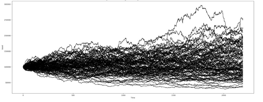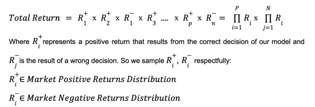 By considering measurable factors: Success Rate (P/T), Market Return Distributions, Target Period (T) we can easily simulate multiple scenarios and speculate return expectations during the target period. considering a flip coin game, on each hand, you have P/T chance to win, and if you win, you can pick up Ri randomly from the market return distribution, and in case of losing, vice versa. We can run this scenario K times and generate several scenarios, Figure3.