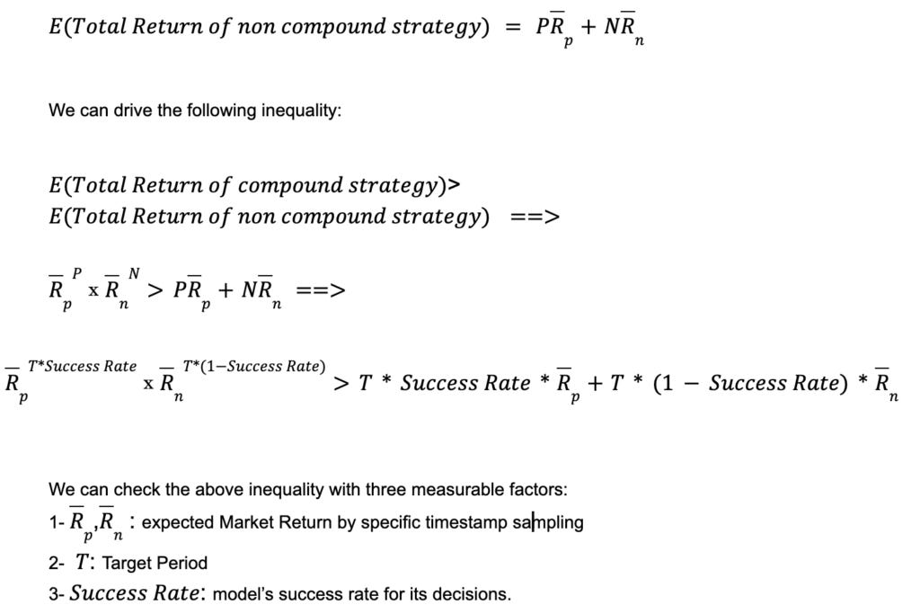 By setting the parameters in the above inequality and checking the expected returns (other statistical measures, like std and skewness, can also be considered to achieve trustable comparison) we can decide to use a compound or a non-compound strategy based on the market during a target period by our existing estimator model.